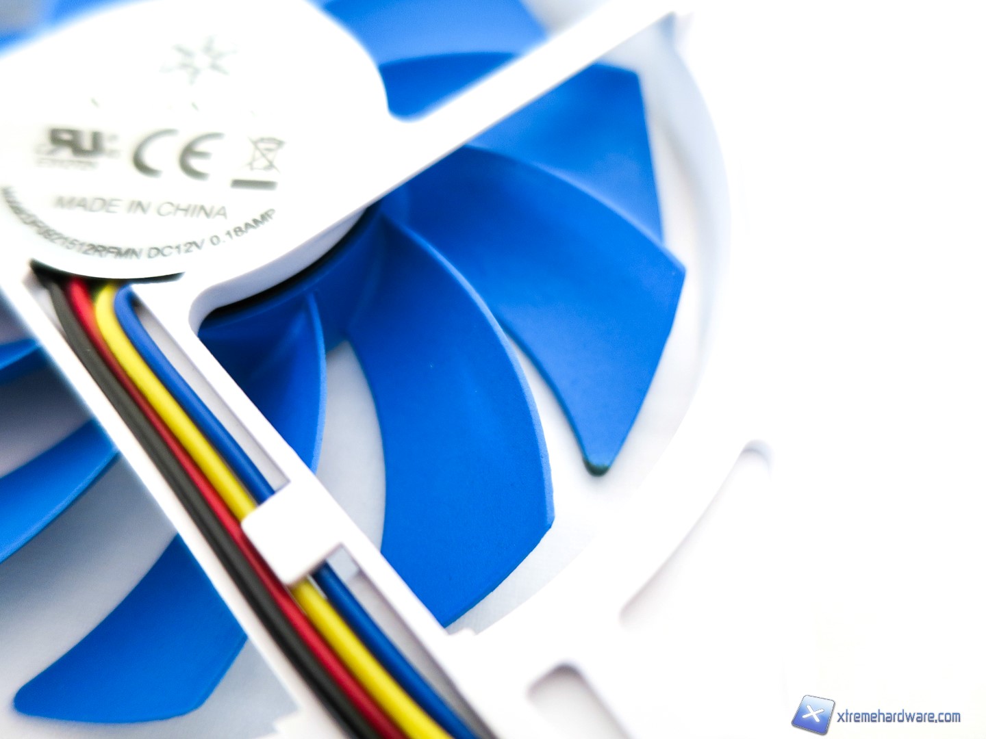 Con il SilverStone Argon AR06 troveremo già preinstallata la ventola da 92mm di tipo Slim che potremo ovviamente rimuovere e sostituire con altro tipo (sempre da 92mm) nel caso in cui il colore non ci soddisfi o non si abbini alla nostra build/configurazione. Rimosse le quattro viti con un cacciavite a croce, possiamo analizzare sul piano estetico la ventola inclusa. Nel dettaglio con l’Argon AR06 troveremo una ventola da 92mm Slim modello SilverStone DF0921512RFMN, sicuramente OEM, in quanto il design della stessa non ricorda alcun tipo di ventola presente a listino di SilverStone. Lo spessore è di 15mm in modo da ridurre l’altezza complessiva dell’AR06. Partiamo ora prima con un analisi estetica. La ventola che accompagna l’Argon AR06 ha una duplice colorazione. Per il frame è stata adottata una classica colorazione di colore bianco mentre per le pale troviamo una colorazione azzurro che sicuramente contrasta bene e dono un buon tocco estetico al dissipatore nel complesso. La serie di dissipatori ad aria di SilverStone utilizza bene o male lo stesso schema e quindi non è una novità trovare questa particolare colorazione. Nel dettaglio le pale che compongono la ventola sono 11 ed hanno una classica forma. Non sono presenti dettagli di nota. Ricordiamo che potremo cambiare la ventola in qualsiasi momento con una di pari dimensioni ma di colore e prestazioni diverse. Per l’aspetto tecnico vengono dichiarati per la ventola SilverStone DF0921512RFMN i seguenti valori. Avremo una rotazione massima di 2500RPM partendo da un minimo di 1200RPM. Un po’ come le ventole viste con gli ultimi AIO recensiti ovvero TD03-Lite e TD02-Lite avremo una rotazione sostenuta che potrà garantire ottime performance dissipative. In unione a tali RPM massimi abbiamo circa 41CFM ed una rumorosità nel range 20 - 28.3dBA quindi tutto sommato nella norma. Infine la ventola adotta tecnologia Rifle Bearing.